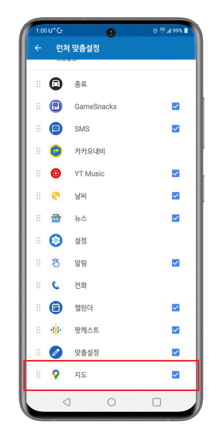 2. 중간쯤에 런처 맞춤설정을 열면 옆 화면과 같이 사용하고 있는 앱들이 보이게 됩니다.