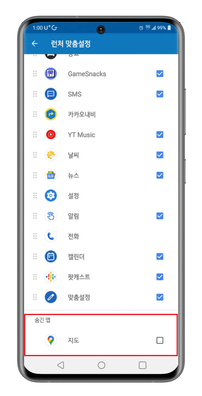 3. 여기서 지도의 체크박스를 해제만 하면 아래와 같이 숨긴 앱으로 이동이 되면서 문제가 해결됩니다.