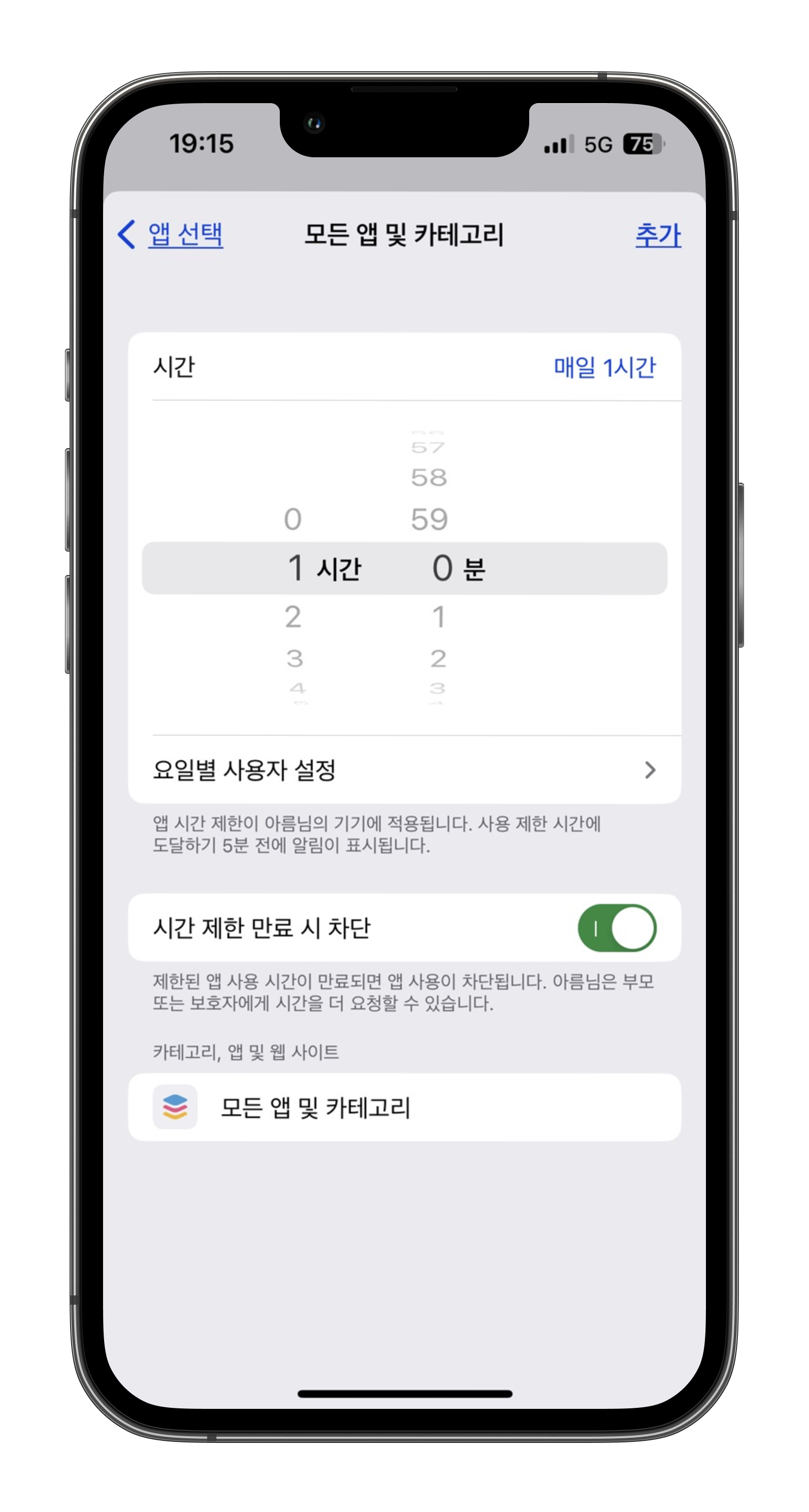 여기까지 다 설정이 완료되면 마지막으로 꼭 자녀 핸드폰에서 스크린 타임이 제대로 설정이 되었는지 확인해 주세요.