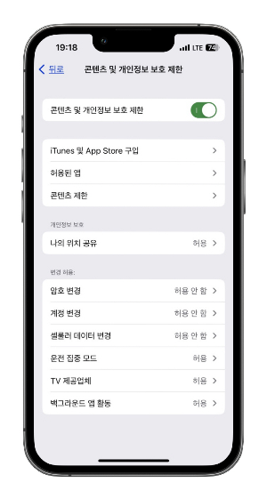 콘텐츠/암호/계정 관련 제한하는 곳으로 중요한 기능이니 꼭 확인해 주세요.