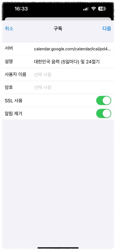 마지막으로 구독 캘린더 추가를 선택하고 아래 주소를 입력하여 서버등록을 하면 끝입니다.