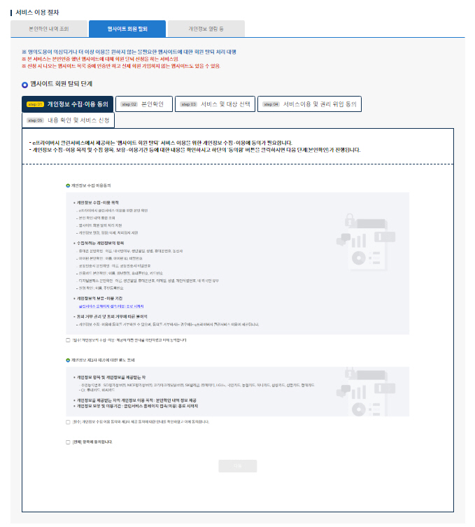 웹사이트 회원 탈퇴 서비스 이용을 위한 개인정보 수집 동의가 필요합니다.